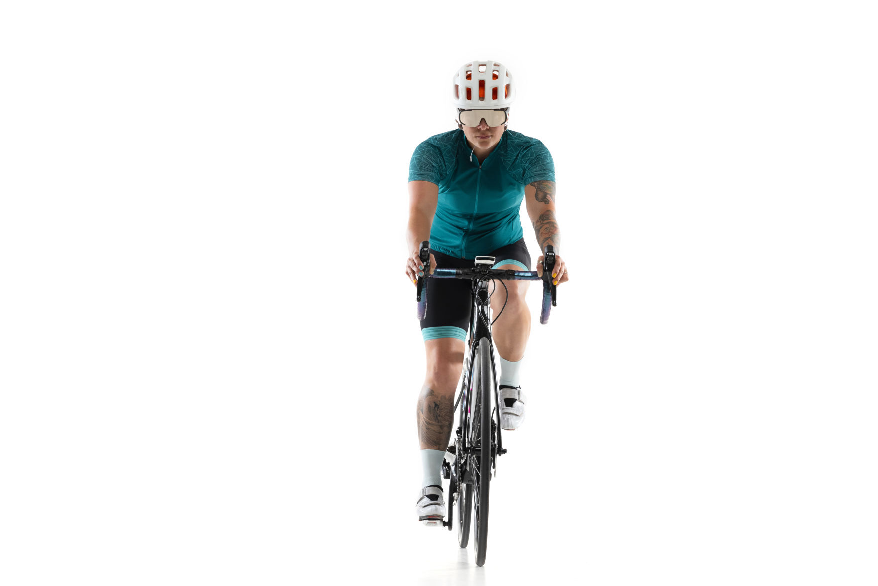 Young professional female bike rider on road bike isolated over white background.